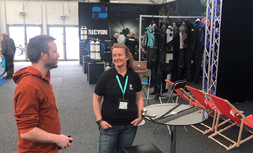GUE-instruktør Annika Persson står på Fue-standen og forteller som kursene hun holder. Hvis du vil bli teknisk dykker er dette dama som kan hjelpe deg videre på veien mot målet!